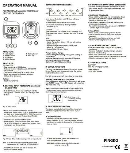-. Binding : Misc. -. Brand : PINGKO -. Feature : Portable to be taken with you in anywhere with Belt Clip / Multi functions:Step counter function, Distance traveled(KM),Calorie calculation,Clock function-12/24 hours format. / Extra LCD screen display, easy for anyone to read / Auto shut off when idle for 1 minute and will return to count when sence you are exercising / Handy clip allows you to clip it neatly to your strap for more accurately calculating.Warranty:Exclusive 12 month warranty. -. IsAutographed : 0 -. IsMemorabilia : 0 -. Label : Anliang International -. Manufacturer : Anliang International -. ProductGroup : Sports -. ProductTypeName : SPORTING_GOODS -. Publisher : Anliang International -. Studio : Anliang International -. Title : PINGKO Portable LCD Digital Multi Pedometer Calorie Counter Walking Step Distance Pedometer with Clock