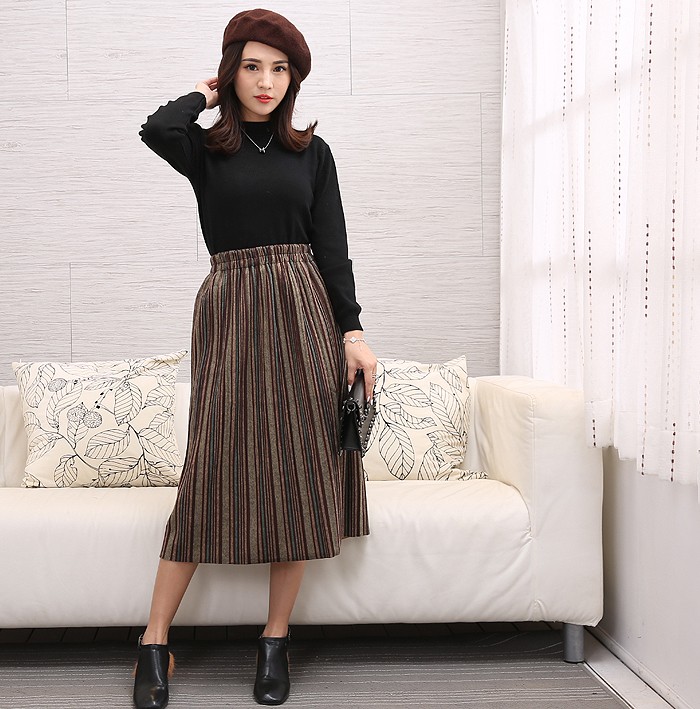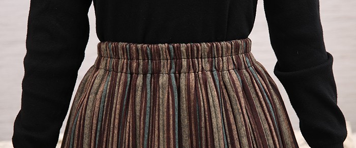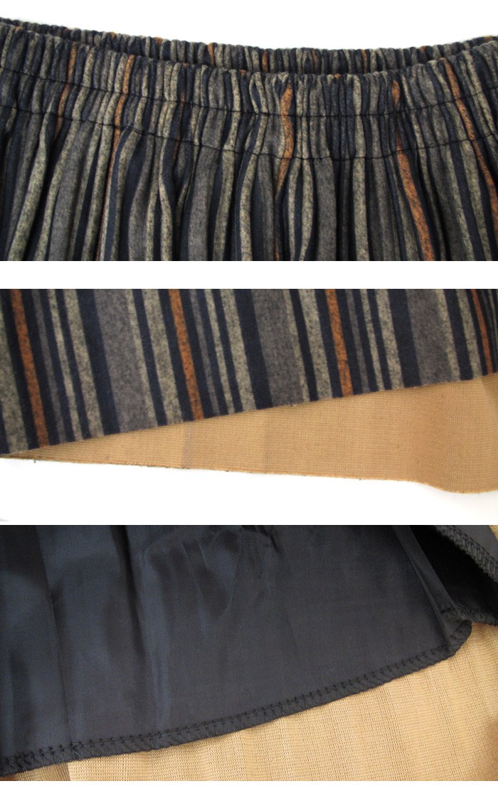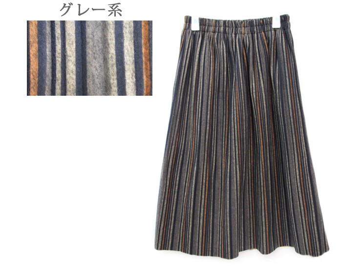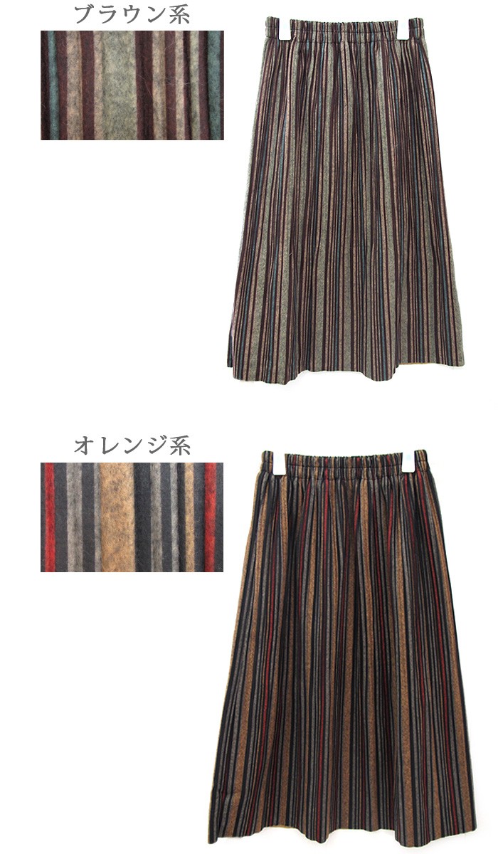 【着こなし】こっくりカラーのマルチカラーストライプのフレアスカート♪レトロなヴィンテージライクな仕上がりです。シンプルなトップスと合わせるだけで様になるインパクトスカート。ウエストゴムで1日ストレスフリーで着用できます。※ パターンアイテムの製造の特性上パターンにずれが生じることございますが、不備ではございませんので予めご了承ください。カラー:グレー系、ブラウン系、オレンジ系モデル身長:160cm原産国:中国製素材:裏地ポリエステル100%、表地ポリエステル100%サイズ:FREE(スカート総丈:92cm/ウエスト:32cm)