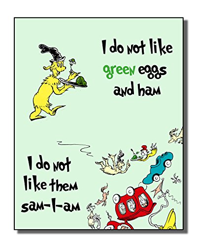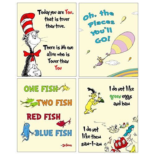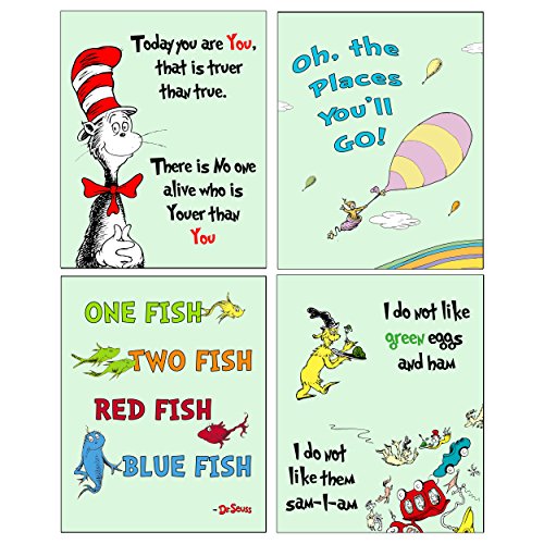 Adorable set of 4 Dr. Seuss themed prints from four popular books: Cat in the Hat, One Fish Two Fish Red Fish Blue Fish, Oh the Places You'll Go and Green Eggs and Ham.