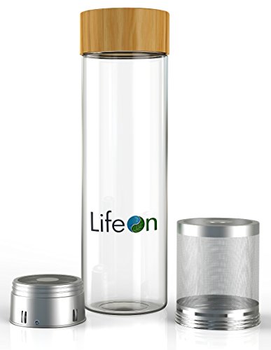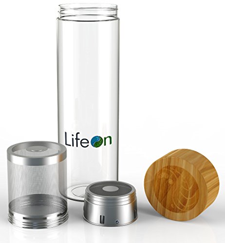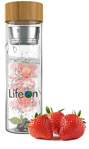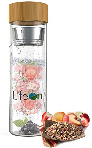 Tea Tumbler with Infuser by LifeON - Tea Infuser, Fruit Infuser Water Bottle - Double Wall Glass, Sweatproof Bottle, Bamboo Lid- Stainless Steel Strainer & Infuser Basket - Easy to Clean