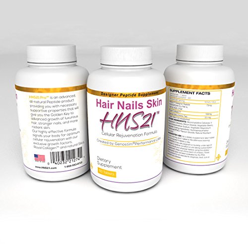-. Feature : HNS21TM is a new science in designer dietary supplements far beyond vitamins and minerals. This exclusive natural peptide product offers numerous supportive properties that give cellular rejuvenation of your hair, nails and skin. / How HNS21TM works? An exclusive formula containing 18 amino acids and 21 GoldenTM Key Bio-Regulators. These designer peptides naturally assist the body in normalizing numerous cellular processes by activating the fibroblast growth factor receptors. When this occurs, the healing reproduction in hair, nails, and skin is accelerated. / HNS21TM's advanced, all-natural peptide formula supporting accelerated hair and nail growth by using natural bio-regulators to signal cellular receptors at a more youthful level. Cellular recovery and rejuvenation signaled by your natural hormones is the Golden Key to longer healthier hair, stronger nails and radiant skin. / Made in the USA in a FDA registered facility meeting Current Good Manufacturing Practices (CGMPs) 100% satisfaction and money-back guarantee. / Clinically Proven and Salon Approved