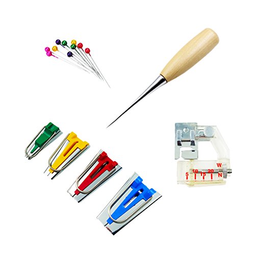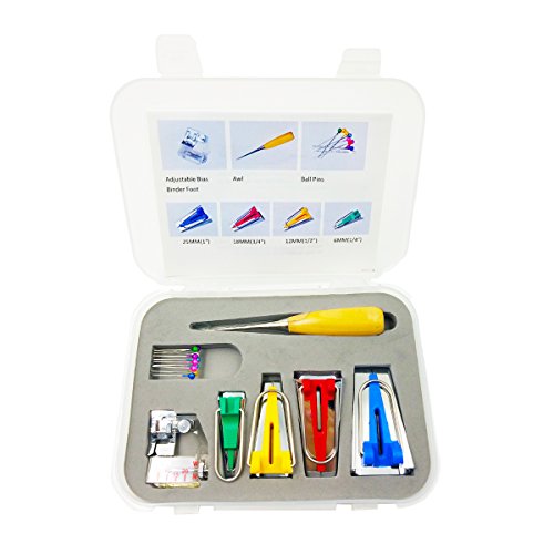 Top-spring Fabric Bias Tape Maker Kit for Sewing Quilting 6/12/18/25mm, Awl and Adjustable Binder Foot, Ball Pins with Case ( Set of 16 )