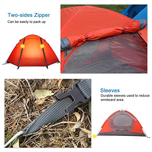 DESIGN- Inner and Outer Tent superpose together (suitable for the camping rainy day). It's spacious and can accommodate large space for 2 people. With DOUBLE-DOORS design, easily entry/exit and keep the inner air more breathable.