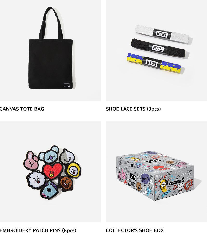 It is 100% authentic official BT21 x Converse ShoesItem Detail- Package : Original Box x 1 , Shoes x 1, Patch Pin x 8pcs , Shoe Lace x 3pcs , Tote Bag x 1