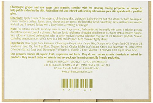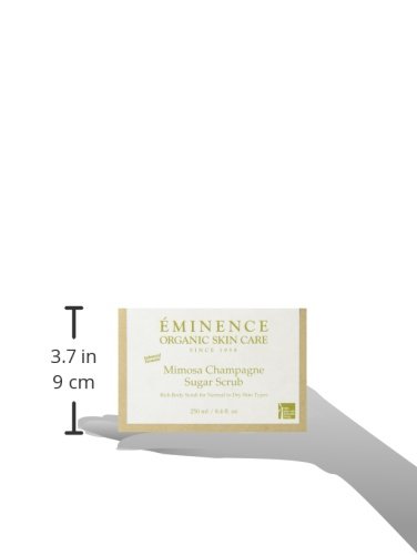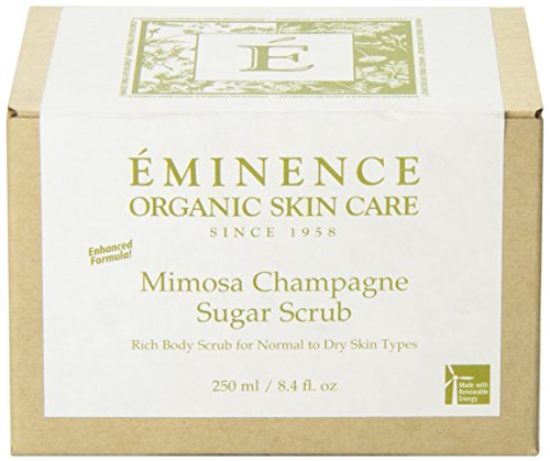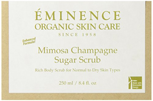 Eminence Organics Mimosa Champagne Sugar Scrub (8.4 oz/250 ml) Benefits For normal to dry skin Gently Exfoliates and refreshes skin Raw sugar cane granules manually exfoliates dead skin cells to enhance radiance and prevent blemishes Features Tokay and champagne grapes neutralize free radicals with antioxidants. They reduce inflammation, preventing hyperpigmentation while detoxifying and hydrating Green tea soothes and heals the skin Eminence Organics is a highly effective, entirely organic skin care line. With all naturally organic ingredients these hand-made products are effective and extremely healing. Rich in vitamins, active ingredients and nutrients, Eminence products will give you immediate results that you will see and feel.Feature