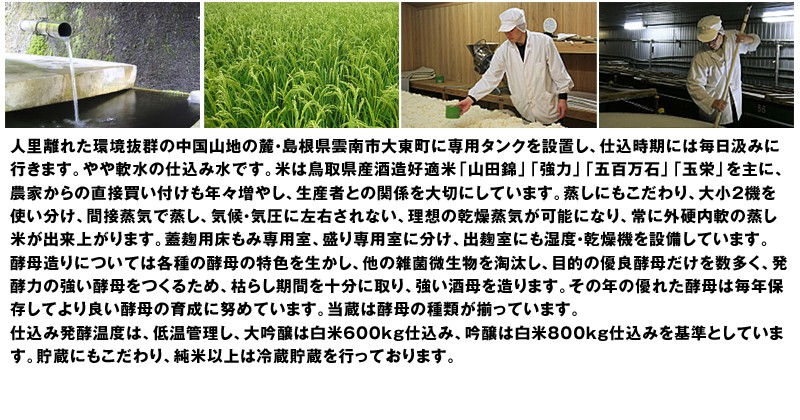 仕込み水は中国山地の麓大東町に専用タンクを設置し、水質はやや