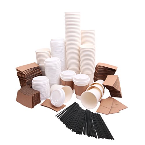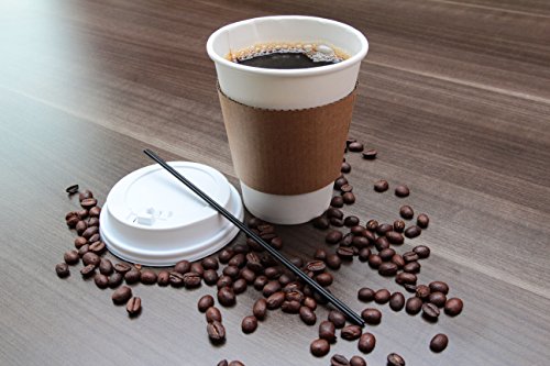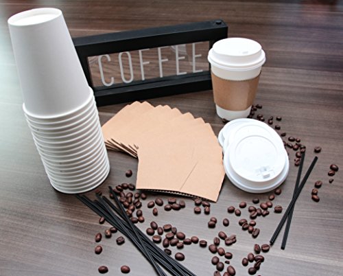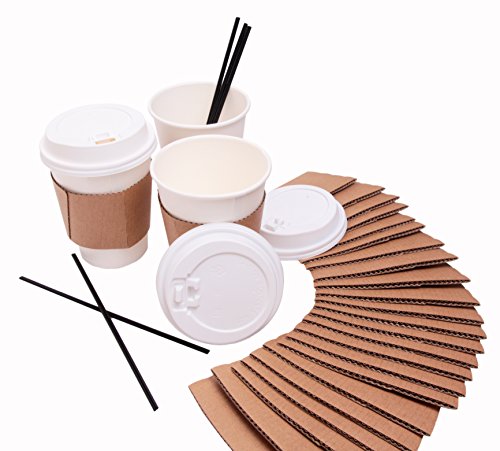 Disposable Coffee Cups with plastic lids, cardboard sleeves and stir straws (125 count) White 12oz, Paper Hot Plastic Travel Lid Office/Party Pack