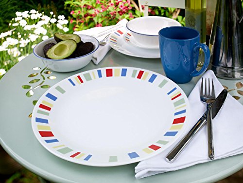 Amazon.com The Livingware Memphis dining set creates a festive mood with a bold and vibrant color scheme based on primary colors. A complete service for four, each service includes a 10-1/4-inch dinner plate, a 6-3/4-inch bread plate, an 18-ounce soup/cereal bowl, and an 11-ounce mug. The plates are white and ringed with squares of red, yellow, green, and blue, creating eye-catching bands of color on the rims. The color scheme is further emphasized by the white bowls, which have a single blue band around the rim, and the solid blue mugs. Made of Corelle's Vitrelle triple-layered glass, the pieces are safe for use in the microwave, oven, and dishwasher. The manufacturer warranty covers cracks, breaks, chips, or stains for three years from the date of purchase. Buy this as a stand-alone set or coordinate with other items from the Country Cottage pattern for a kitchen full of relaxing rural dreams. --Jeff Dalto What's in the Box 4 place settings. Each place setting consists of: dinner plate, bread plate, soup/cereal bowl, mug. 16 pieces total. 0