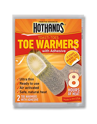 Product Description Perfect for skates, ski boots, or shoes, the Heatmax Toasti Toes Foot Warmers are air-activated toe warmers with full adhesive on one side that sticks to your socks and helps them to stay firmly in place. Toasti Toes provide up to five hours of 100-degree-Fahrenheit warmth and are designed for the active sportsman who will be walking or moving continuously while outdoors in the cold. All Heatmax warmers are made of natural materials, including iron powder, water, salt, activated charcoal, and wood fiber. When exposed to air, these materials react together to produce heat through an extremely fast oxidation (or rusting) process. Users should allow 10 to 20 minutes for the warmers to reach their optimal temperatures. 0