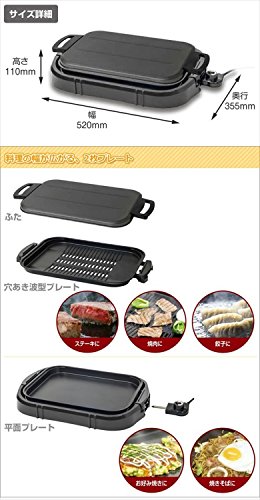 ●전원:AC100V(50/60Hz)●소비전력:1300W●코드 길이:1.8m●플레이트내 치수:폭39 (길이)깊이29 깊이3cm●온도 조절:보온(약80도)-강하다(약230도)●평면 플레이트와 파형플레이트2 매첨부(부)●혈부착타입파형플레이트이기 때문에,기름이 아래에 빠짐,야키니쿠(한국식 갈비)도 맛있게!