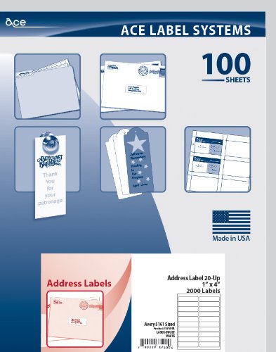Ace Label Mailing, Address & Shipping Labels for Laser and Inkjet Printer, Avery 5161 Sized, 4 x 1 Inches, Pressure-Sensitive Labels, White, 100 Sheets, 20 per Sheet, 37500L