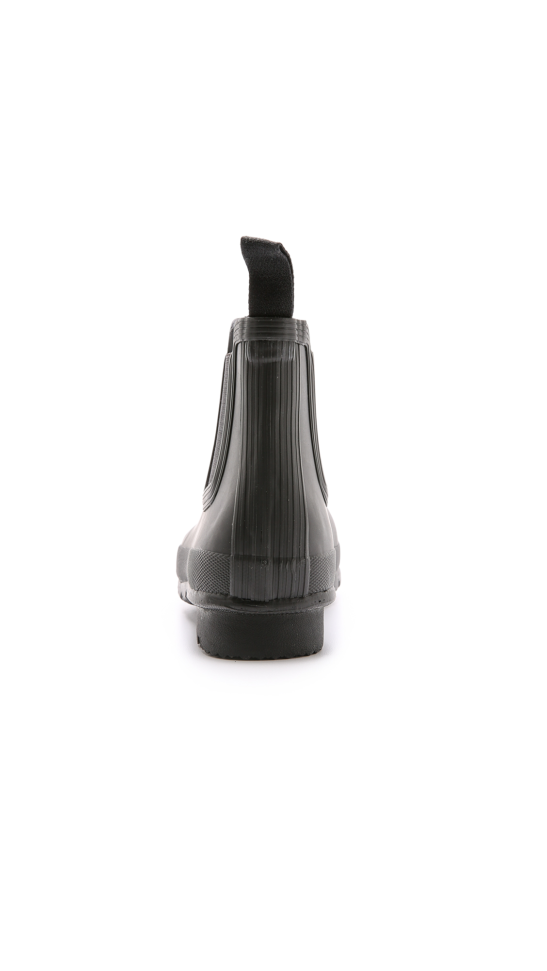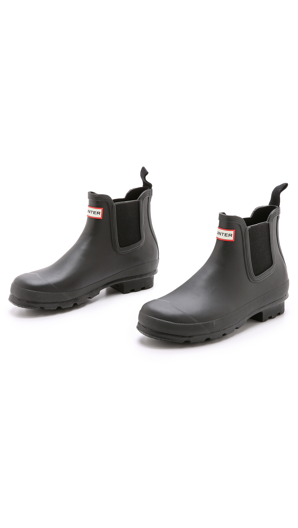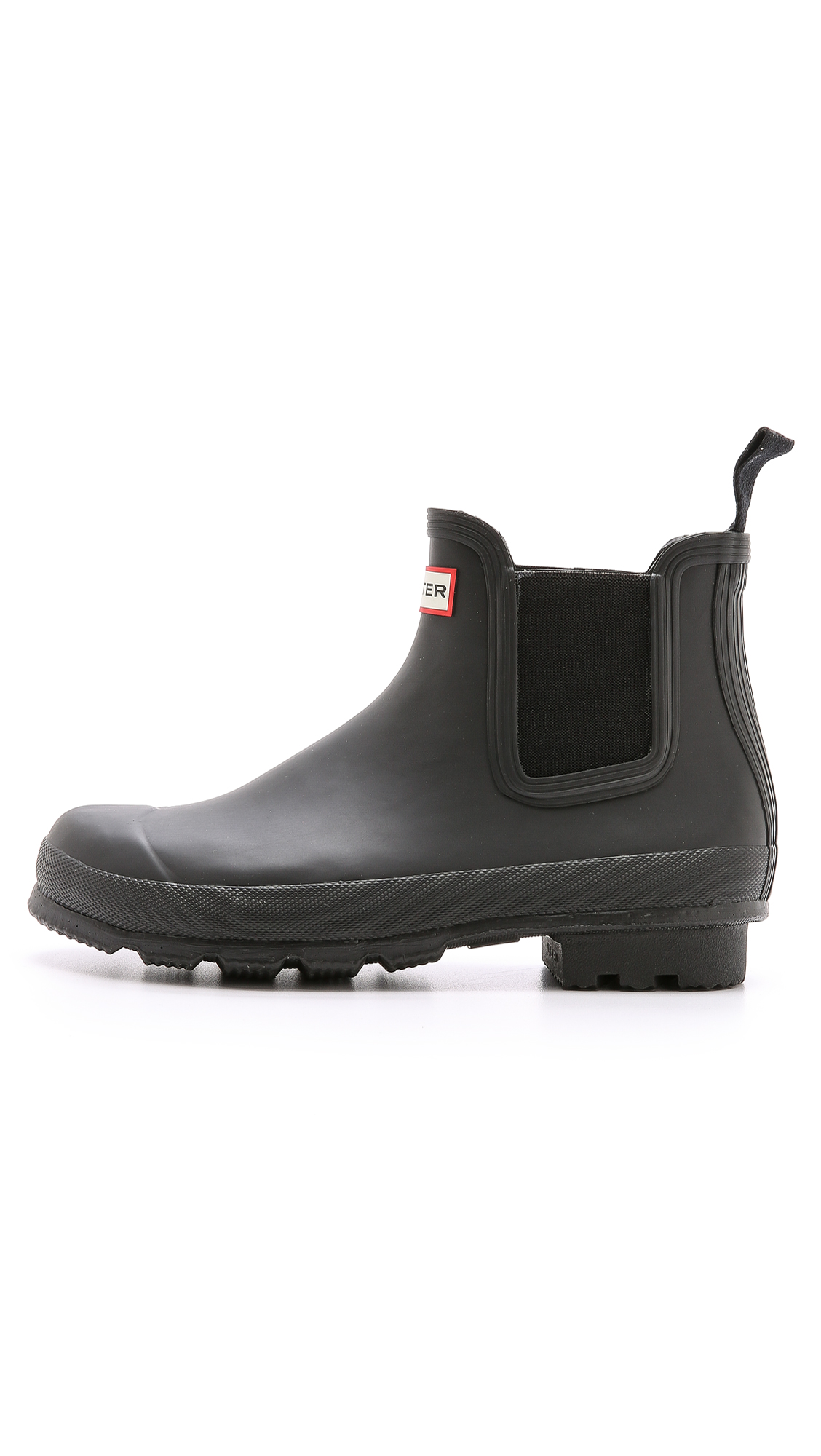 Hunter rain boots in the classic Chelsea style. Inset elastic gores relax the fitted shaft. Soft nylon lining and a cushioned footbed. Lug sole.Fabric: Rubber.Imported, China.Style #HUNTS20238