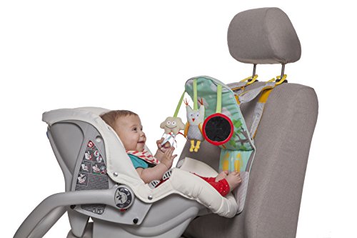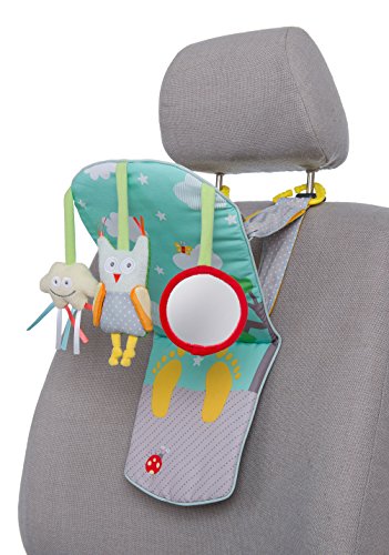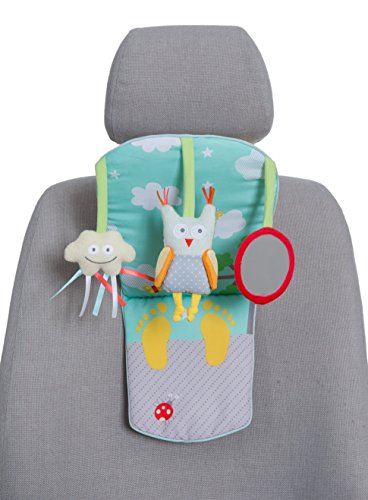 Babies Love To Travel With This Back Seat Activity Center. Your baby can get bored in a rear-facing seat, but they'll be happy to go for a drive with this fun backseat activity center. It's easy to attach the toy to the headrest with the simple plastic clips, mounts in seconds. Use the Velcro straps to adjust the height. The pastel colors and fun characters invite your baby to play and explore the toys, enriching their fine motor skills. The cloud has colorful fabric tabs babies love to tug, and a jingle bell inside. The owl has knotted feet and a rattle inside. Baby safe mirror engages baby with their own reflection. Suitable for babies from birth and up.