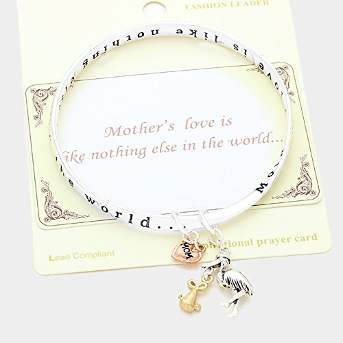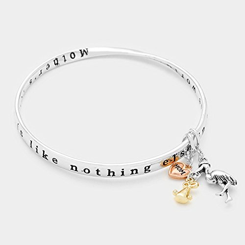 You will love this beautiful "Mother's Love is Like Nothing Else in the World" engraved charm bangle bracelet. Comes with adorable stork charm that measures 1" x .75", and heart charms that reads "Mom" that measures .25". Perfect gift for the congratulations to an expectant mother. Its a perfect baby shower gift. Comes new in package with a prayer card that reads " Mother's love is like nothing else in the world", and inside a box perfect for giving.Feature