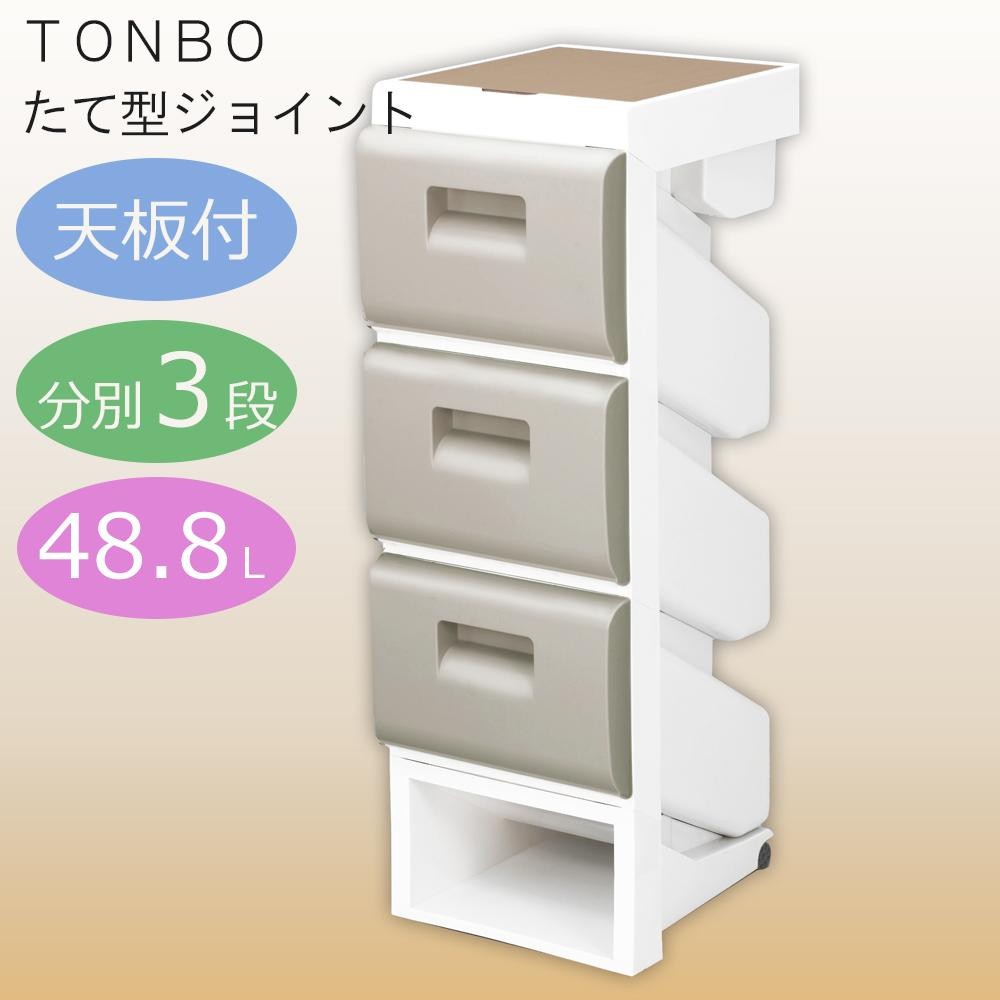 キッチンで使いやすい多分別シリーズです。天板に収納ができ便利です。後ろには、移動に便利なコロ付きです。 製造国:日本 素材・材質:本体・他:ポリプロピレン天板:MDF(繊維板) 商品サイズ:37.5×31.5×89cm 重量:約5100g 仕様:容量:48.8L(14L×3、6.8L) 付属品:取扱説明書 ※サプライヤー直送品 ご注文後3~4営業日後の出荷となります【商品名】TONBO たて型ジョイント分別3段天板付 48.8L ブラウン