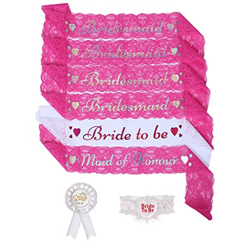 - Bachelorette Party Set - Bride to be sash x 1, Maid of Honor sash x 1, Bridesmaid sash x 4, Badge x 1, Leg Flower x 1. Total 8 pieces .