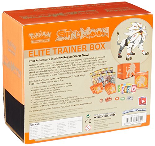 In each Sun & Moon Elite Trainer Box you will receive 8 Pokémon TCG: Sun & Moon booster packs, 65 card sleeves featuring Solgaleo or Lunala, and 45 Pokémon TCG Energy cards