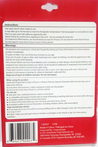 -. Feature : Air-Activated Heat Wrap / Ultra Thin, with Adhesive to Hold in Place / Odorless Chemical Reaction / Up to 8 hours of Relief, / For Fast Relief of Minor Aches and Pains due to: Arthritis, Strains and Sprains