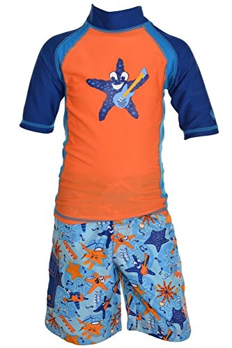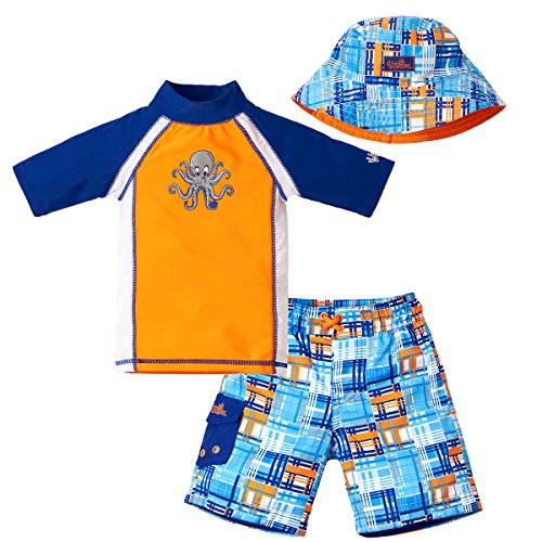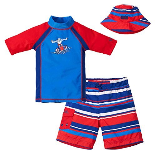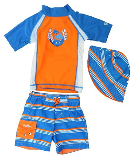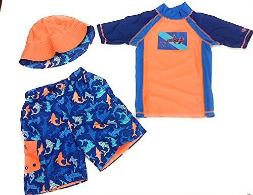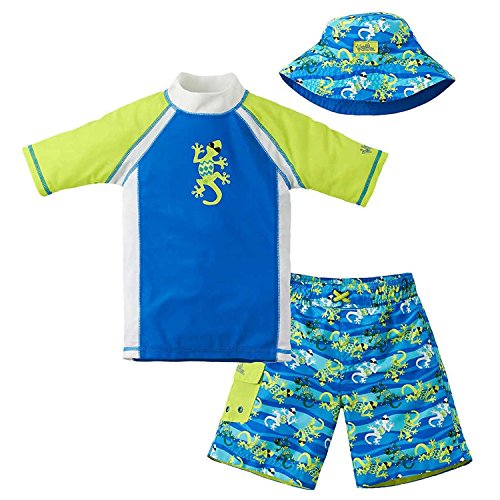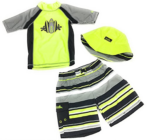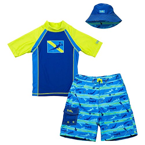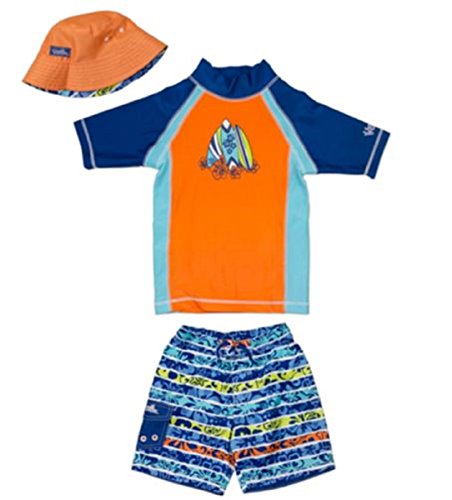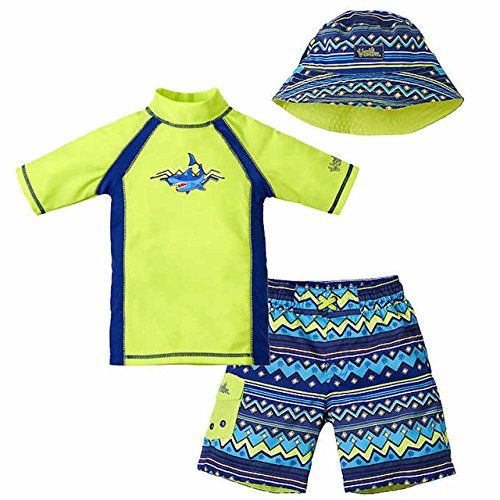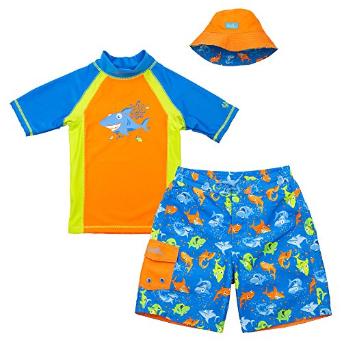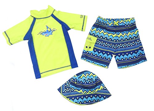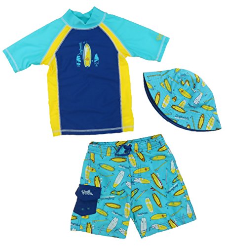 Protect your little one from the sun with these UPF + 50 Sun Protection Swim Set. This set includes a Shirt, Short and a reversible hat. They are made of a unique blend of yarns created from 87% Polyester and 13% Elastane. They come in really cute colors and designs.