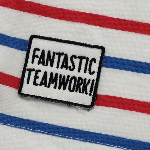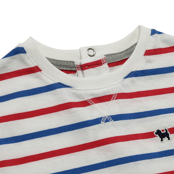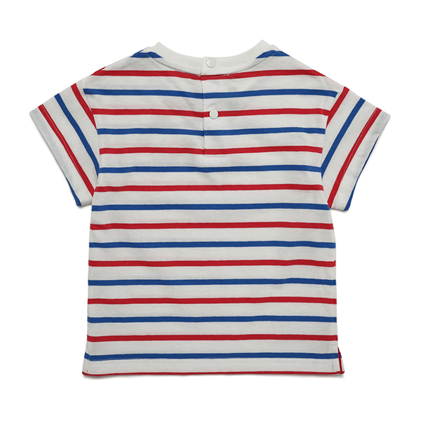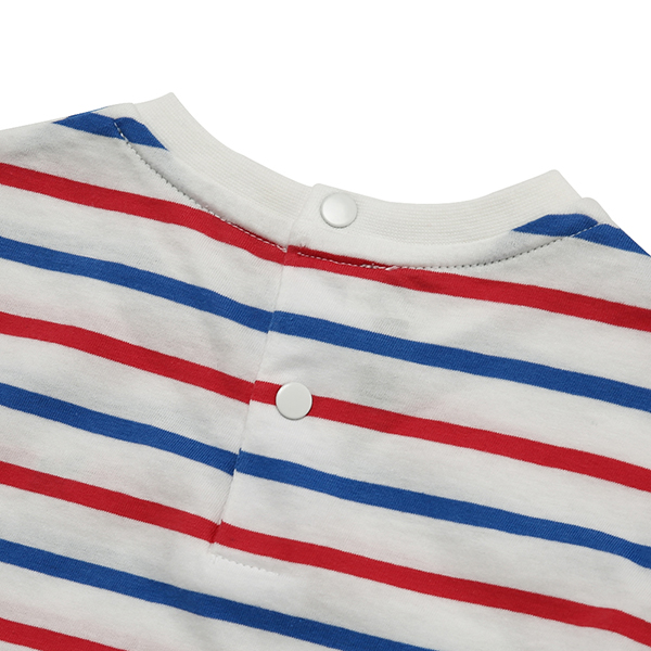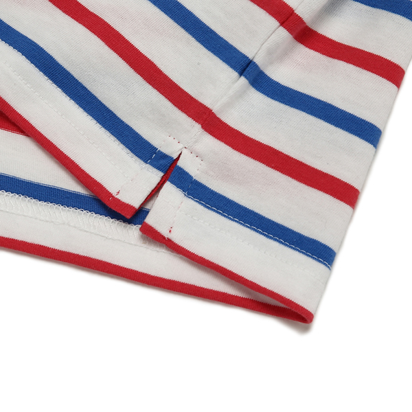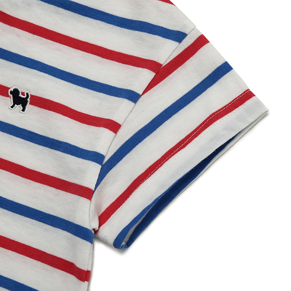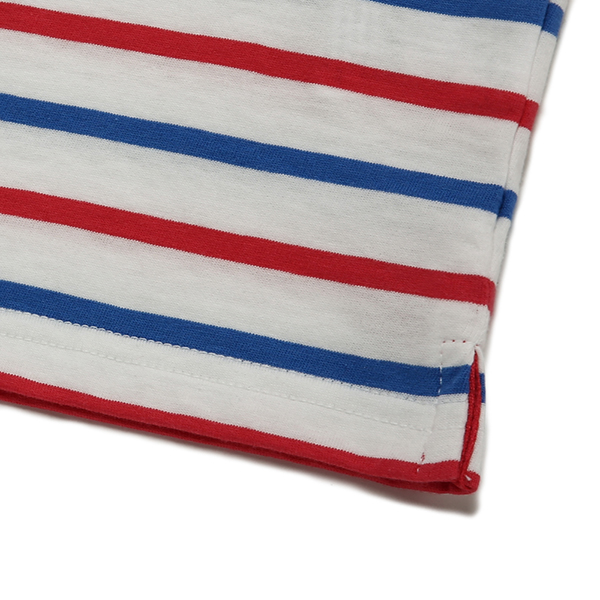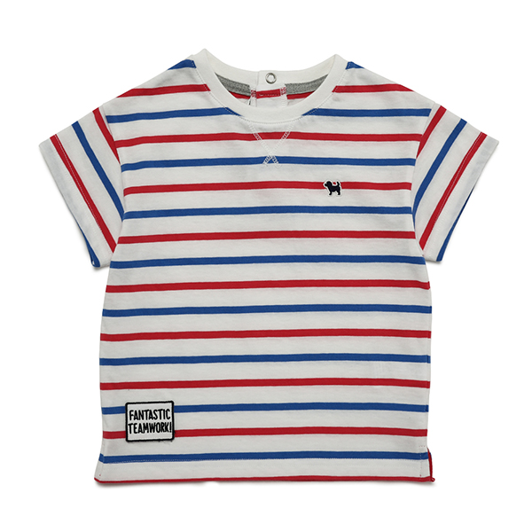 레트로한 컬러가 믹스된 드롭소매의 티셔츠로, 클린한 스트라이프와 와펜 포인트가 돋보입니다.
