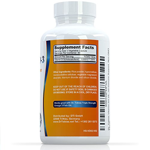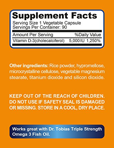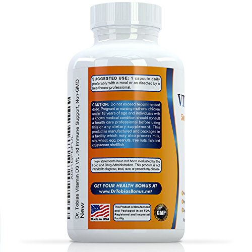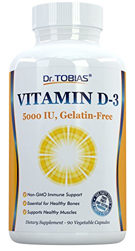 -. Feature : Dr. Tobias Vitamin D3 helps to support healthy muscle function, bone & teeth health, and to provide immune support. / Daily dosage of Vit d3 5000 iu with only one capsule. The recommendation of the Vitamin D Council is 5,000 IU Vitamin D daily for adults. / Gelatin-free. Vegetarian capsules. Non-GMO. High Bioavailability. / Our Non-GMO Vitamin D3 immune support and bone health supplements are third party tested to ensure potency and purity. / Made in the USA in a GMP certified facility. High Bioavailability.