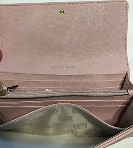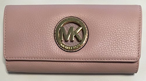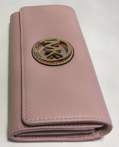 This flap wallet from Michael Kors is wrapped in beautiful pebbled leather with golden tone hardware. It is accented with Michael Kors circular logo on the front and secures with a snap closure. The leather and fabric interior features 6 credit card slots, a zippered coin compartment and several full length bill compartments. There is a full length open slip pocket on the back. It measures approximately 7.75 inches (L) x 4 inches (H) x 1 inch (W). Comes with a beautiful Gift Box.Feature