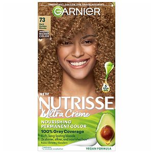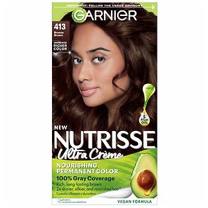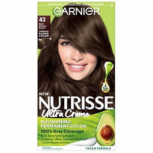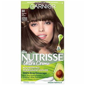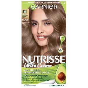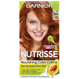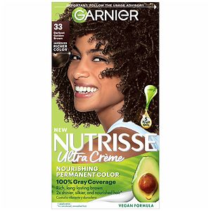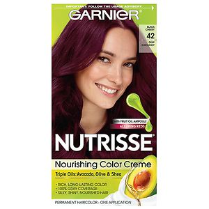 See why nourished hair means better color.Garnier Nutrisse Nourishing Color Creme penetrates deep into hair fibers to nourish and condition so hair takes color better and holds it longer, for richer, longer lasting hair color from root to tip and 100% gray coverage.Garnier Nutrisse haircolor comes with an ampoule of grapeseed oil to start nourishing hair while you color.The non-drip formula spreads easily, smells great, and the after-color conditioner is infused with 3 fruit oils - avocado, olive and shea - for silkier, shinier, more nourished hair.Rich, long lasting hair color in a non-drip formulaNourishing triple fruit oils: avocado, olive, and sheaPermanent with 100% gray coverage