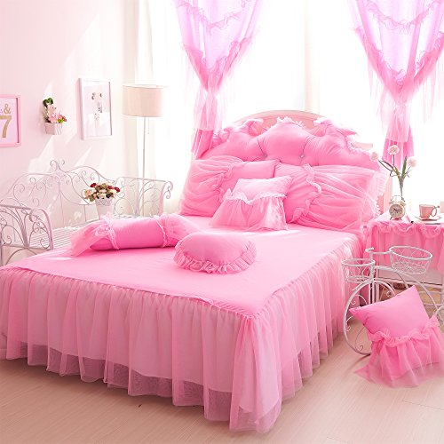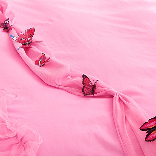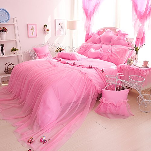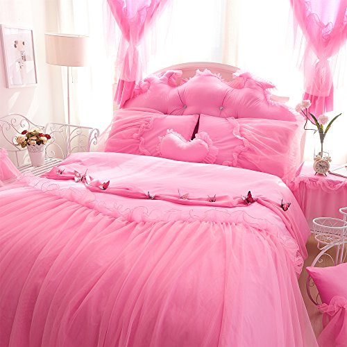 TWIN SIZE (4ft Bed) 1-piece Duvet Cover 59 by 79 inches (150 by 200cm) 1-piece Bed Skirt 47 by 79 inches (120 by 200cm) 2-piece Pillow Cases 19 by 30 inches (48 by 74cm) FULL SIZE (5ft Bed) 1-piece Duvet Cover 79 by 91 inches (200 by 230cm) 1-piece Bed Skirt 59 by 79 inches (150 by 200cm) 2-piece Pillow Cases 19 by 30 inches (48 by 74cm) QUEEN SIZE (6ft Bed) 1-piece Duvet Cover 79 by 91 inches (200 by 230cm) 1-piece Bed Skirt 71 by 79 inches (180 by 200cm) 2-piece Pillow Cases 19 by 30 inches (48 by 74cm) KING SIZE (6.6ft Bed) 1-piece Duvet Cover 87 by 94 inches (220 by 240cm) 1-piece Bed Skirt 71 by 79 inches (180 by 200cm) 2-piece Pillow Cases 19 by 30 inches (48 by 74cm) Features 100% Washed Cotton,a slight wrinkle,like old style.Feel like super soft,and comfortable. Very cute Korean Bedding set with handmade butterfly. Beautiful color! Pink Color or Purple Color Reactive Dying,Non-Fading,Non-Pilling, Non-Wrinkle. Fabric Density:133x72,Fabric Count:40x40 Lace bedding set!!! Very romantic and cute!!! If you want to choose a Korean bedding set so we hope that you should not miss it. Cares Machine Wash in Cold, Dry on Low. Our Customer Satisfaction Money-Back Guarantee If you are not satisfied with the Lotus Karen Bedding Sets,just return it within 30 days for a full refund. No questions asked,no hassle. 0