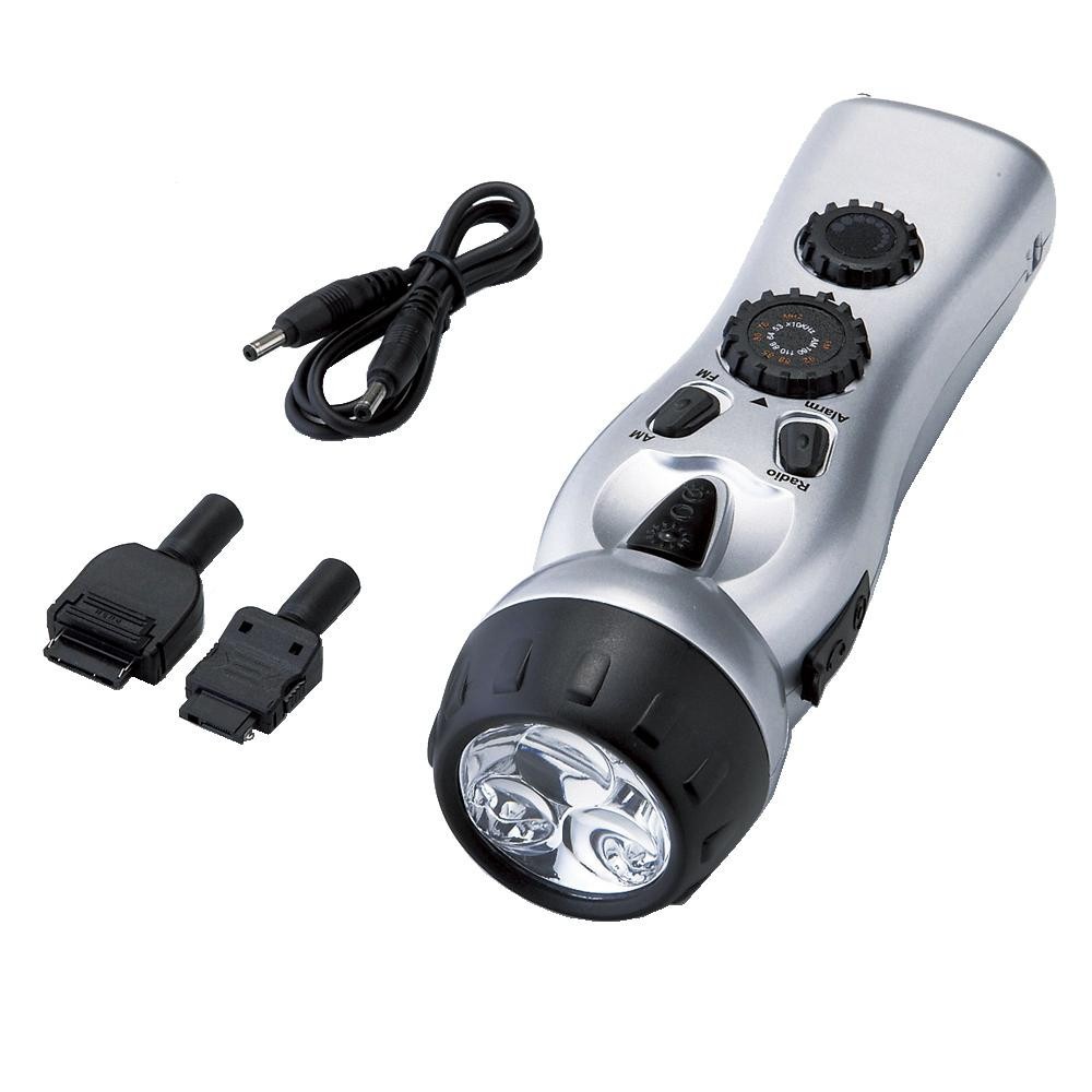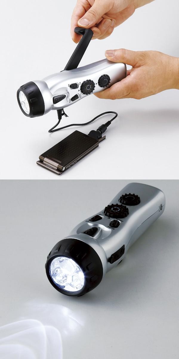 | AM/FMラジオ付の手回し充電式懐中電灯です。携帯電話の充電も可能なので、アウトドアや災害時に欠かせません。サイレン機能付。 |