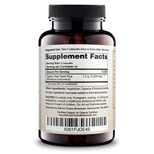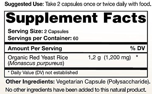 -. Feature : Certified Organic Supplement (Grown without the use of herbicides or pesticides) / Organic Red Yeast Rice (600 mg per capsule) (1,200 mg per serving) / Laboratory Tested for Potency & Purity (Manufactured in the USA) / No Artificial Ingredients or Preservatives / Non-GMO, Gluten-Free, Vegetarian