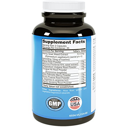 - Feature : Horny Goat Weed - Is designed to give you more energy as well as optimize other functions in your body. Can provide energy that lasts for hours instead of minutes. / Powerful formula for real results, every day! / Natural supplement with Mucuna Pruriens, Muira Puama, Panax Ginseng root and Tongkat Ali Powder for stamina / L Arginine helps boost nitric oxide levels for optimal performance - No2 (with our formula) / USA made and 100% money back guarantee - USA made and 100% money back guarantee - no questions asked! - see your testosterone boosted and full time energy