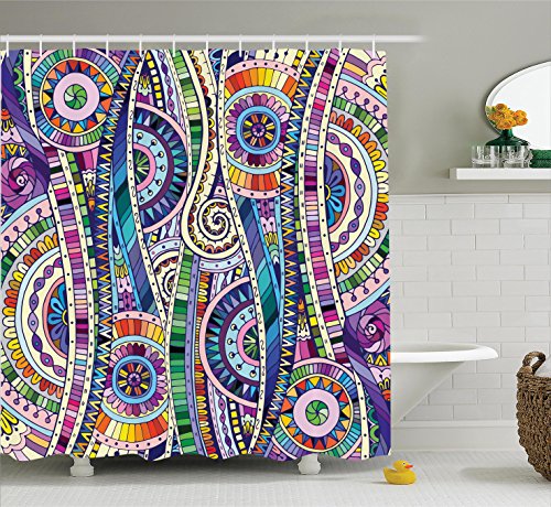 Ambesonne Home Decor Collection, Geometric Mosaic Style Colorful Illustration Flower Pattern Ornamental Doodle Native Art, Polyester Fabric Bathroom Shower Curtain Set with Hooks, Purple Green
