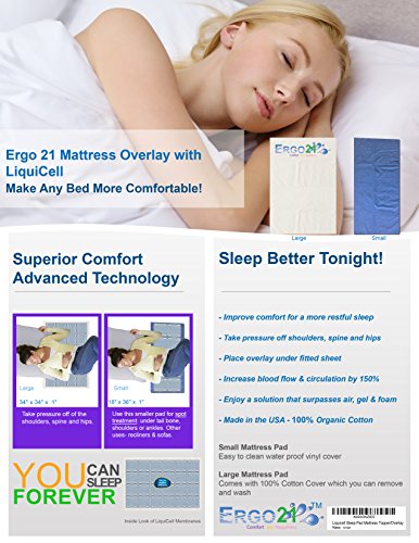 -. Binding : Health and Beauty -. Brand : Shakti -. Color : Blue -. EAN : 0753182077697 -. Feature : Improve comfort for a more restful sleep / Take pressure off of the shoulders, spine and hips - Eliminate pressure points with equal distribution / Enjoy a solution that surpasses air, gel & foam / The Vinyl Cover is water proof and easy to clean. / Increase blood flow & circulation by 150% -. Label : Shakti Inc. -. Manufacturer : Shakti Inc. -. MPN : 104-sleepCushionSmall -. PackageQuantity : 1 -. PartNumber : 104-sleepCushionSmall -. ProductGroup : Health and Beauty -. ProductTypeName : HEALTH_PERSONAL_CARE -. Publisher : Shakti Inc. -. Size : 18" x 36" x 1/8" -. Studio : Shakti Inc. -. Title : Liquicell Sleep Pad Mattress Topper/Overlay -. UPC : 753182077697