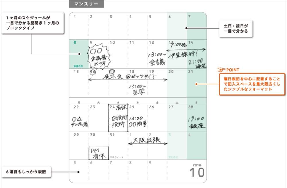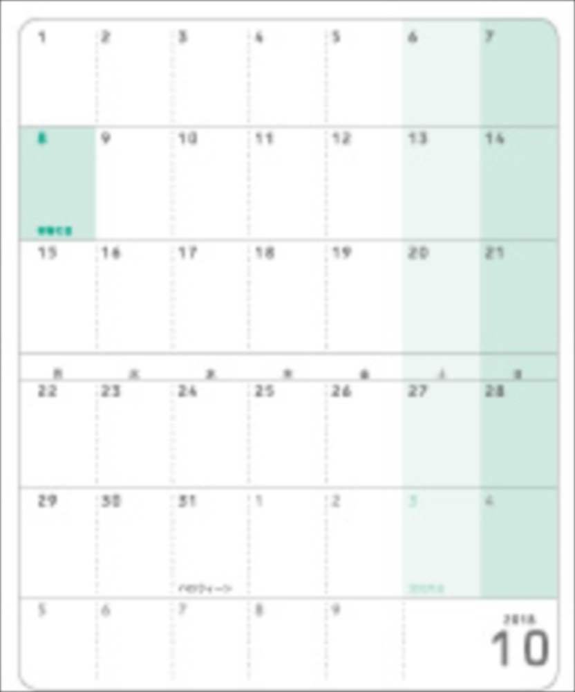 Easy-to-see monthly blocks that allow you to see holidays and holidays at a glance Simple format that widens the maximum filling space by placing the notation in the center of the weekly notation (2017 October - 2019 January).