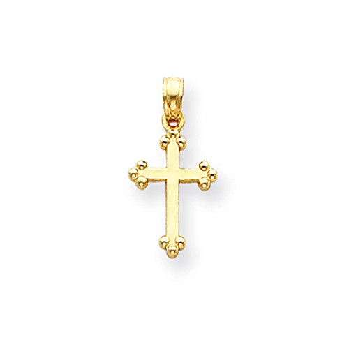 The Budded Cross represent the Holy Trinity with a trefoil at each end of the cross. Crafted from 14 karat yellow gold with a polished finish and textured back. Charm measures 3/4 Inch x 3/8 Inch, including bail. Chain not includedFeature