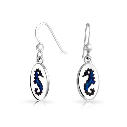 -. Title : ブリングジュエリー スターリングシルバー925製 ネイビーブルー アワビ貝殻 タツノオトシゴ ダングル ピアス