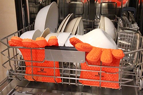 - ✔ YOU WILL LAUGH AT REGULAR OVEN MITTS - WHEN YOU BUY THESE GLOVES. Unlike regular Oven Mitts our Silicone Cooking Gloves are 100% Waterproof and Dishwasher safe. Hence they are not affected by boiling water, steam or hot juices. Now you can place and remove food in boiling water - handle juicy meats with ease and comfort without worrying about the gloves getting wet. Throw them in the Dishwasher once you are done with them.