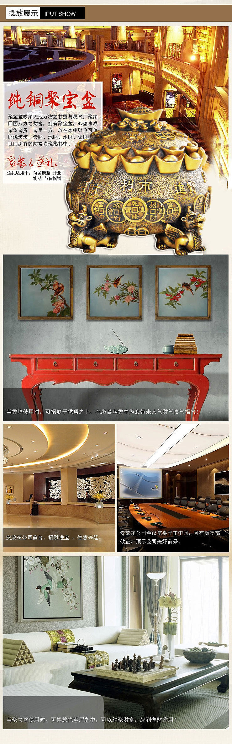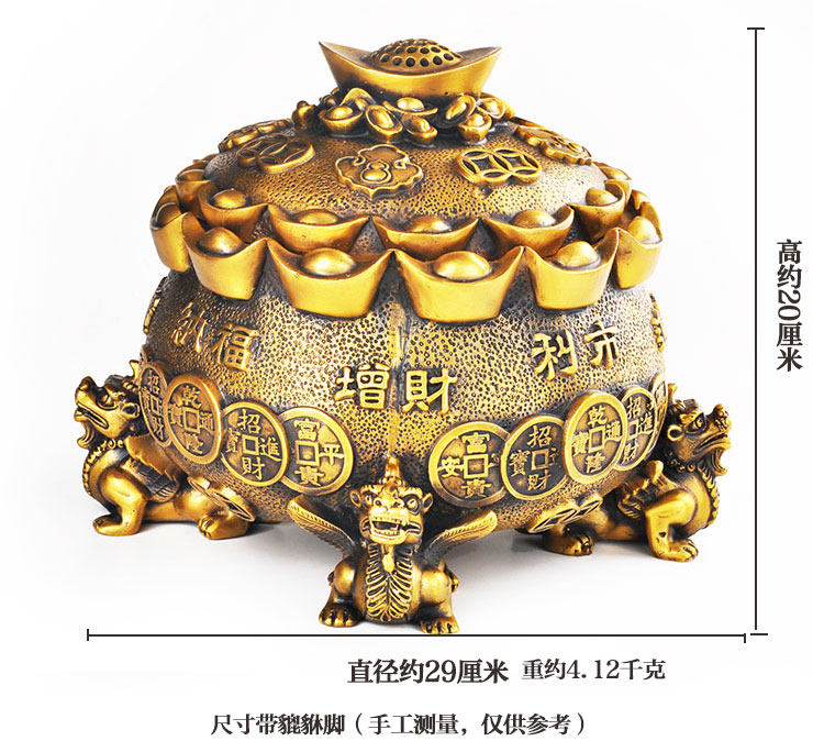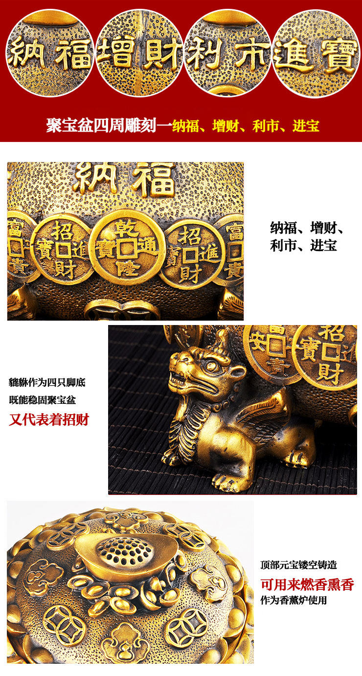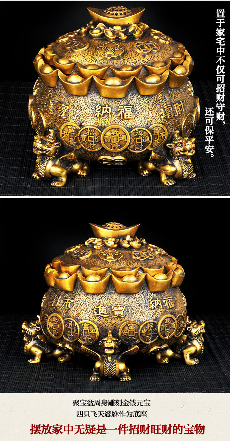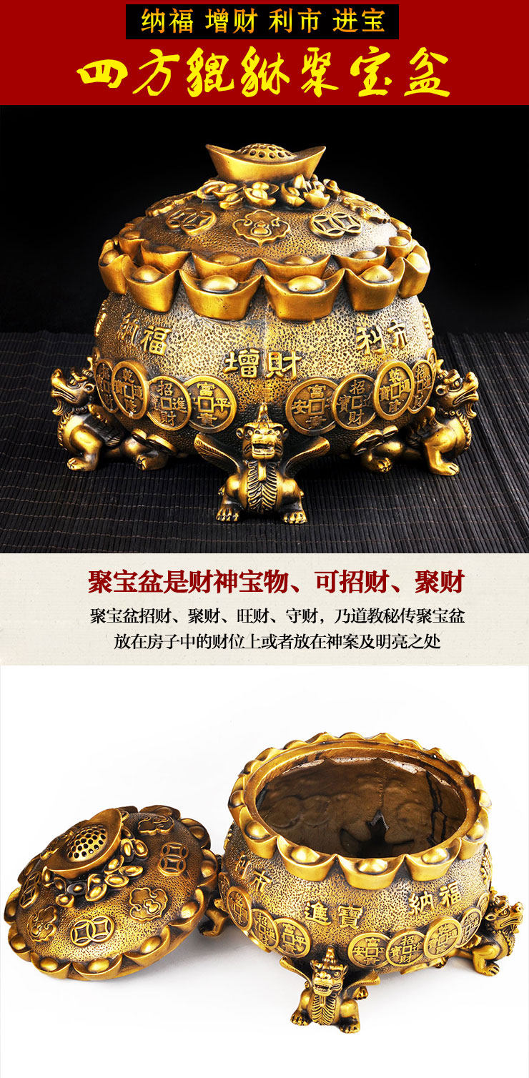 开光铜聚宝盆摆件四方鼎香炉招财貔貅元宝皮丘风水香炉饰品