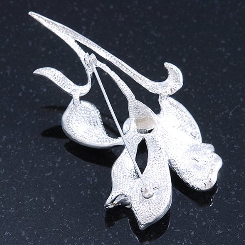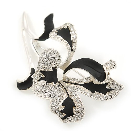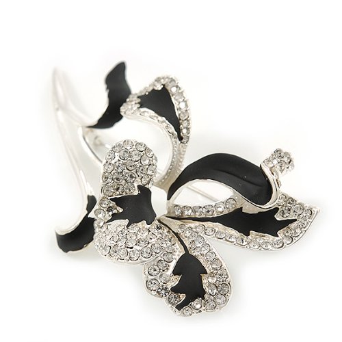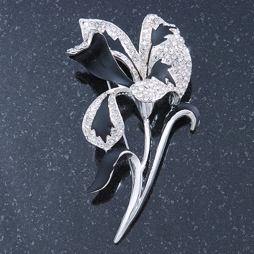 -. Title : Black/ Silver Tone Clear Swarovski Crystal 'Calla Lilly' Brooch - 75mm Length