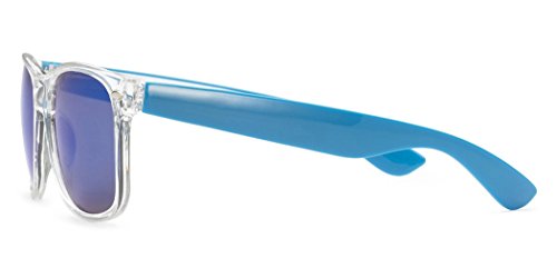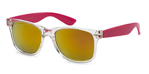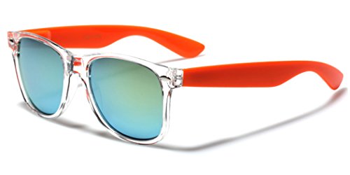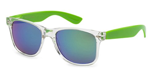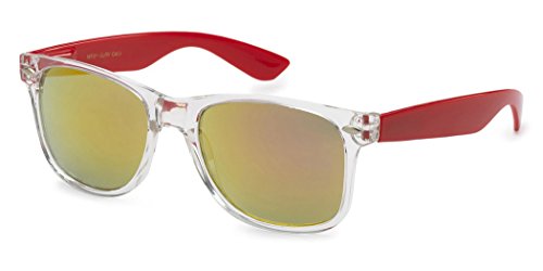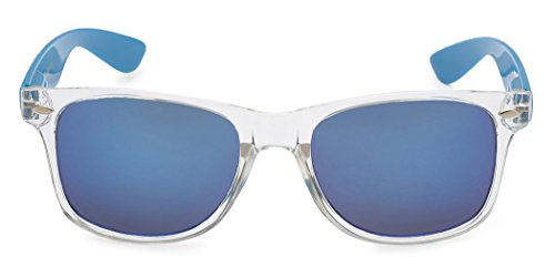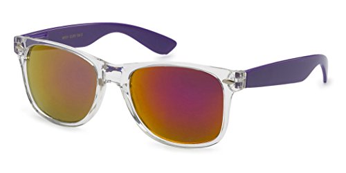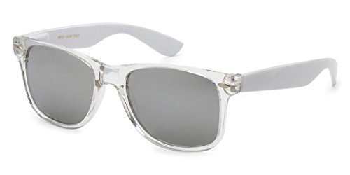 -. Brand : Retro Rewind -. Department : mens -. Feature : XtremeUV sunglasses are created to stand out and compete with designer items in $20-$50 P.R.Ice range. / UV400 standard - 100% UV Protection / Drawstring Pouch included / All orders are shipped on the same or following business day / Sunglasses measurements: Full Width - 143 mm (5.65"), Full Height - 48 mm (1.9"), Lens Width - 52 mm (2.05") -. ProductGroup : Apparel -. ProductTypeName : EYEWEAR -. Title : Colorful Two Tone Wayfarer Sunglasses - Crystal Clear Translucent Frame with Color Mirror Lens