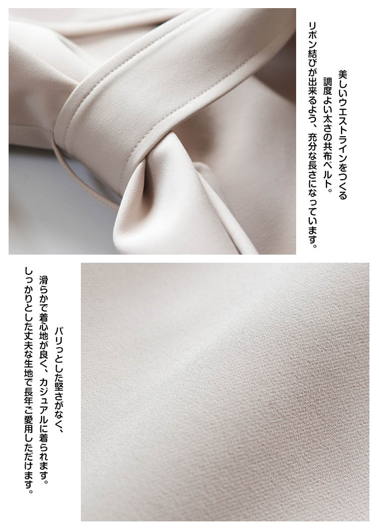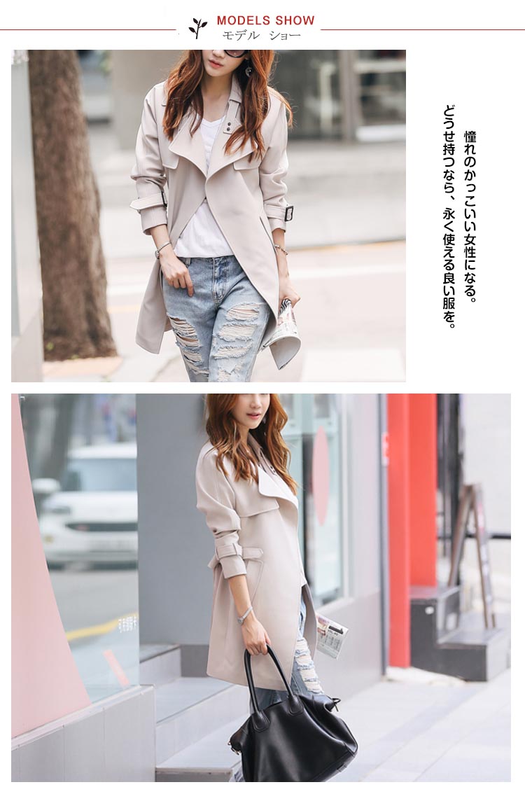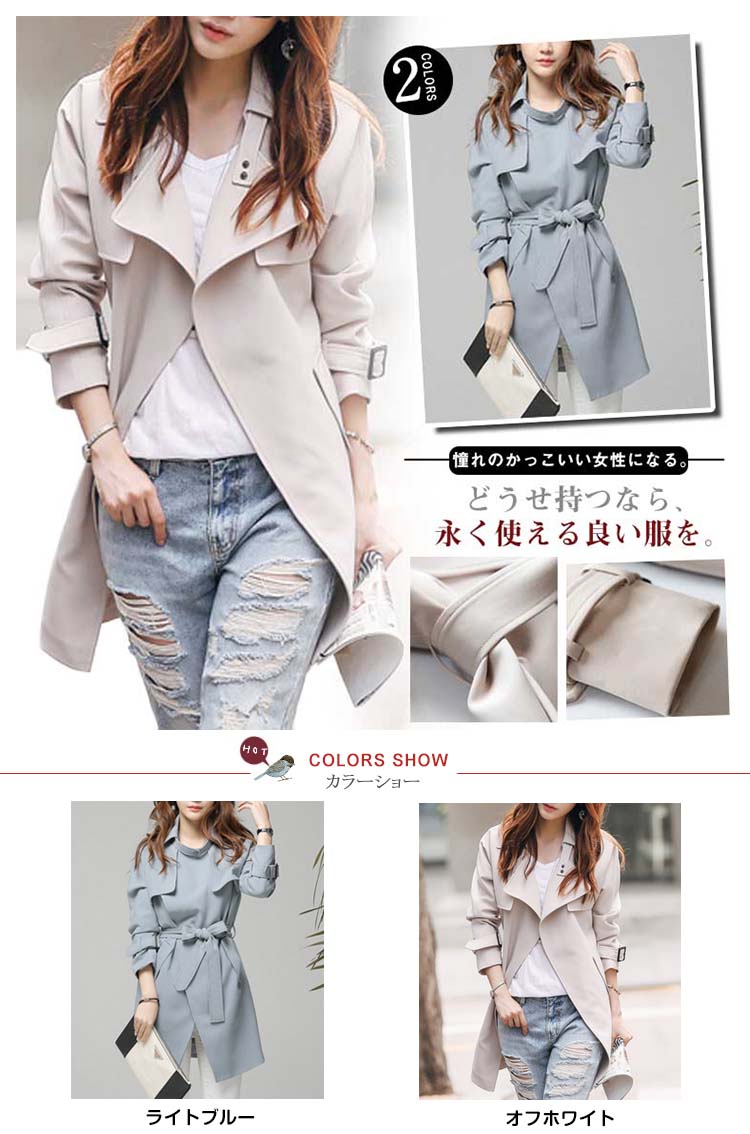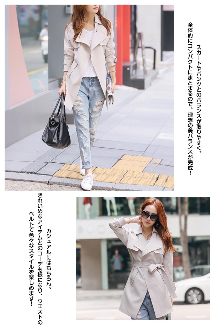 | 憧れのかっこいい女性になる。どうせ持つなら、永く使える良い服を。シンプルな中にもトラッドなムード感を感じさせるトレンチコートです。スカートやパンツとのバランスが取りやすく、全体的にコンパクトにまとまるので、理想の美バランスが完成!カジュアルにはもちろん、きれいめなアイテムとのコーデも様になり、ウエストのベルトで色々なスタイルを楽しめます!トレンドレスに活躍する定番アウターは絶対おすすめの1枚です。 | |