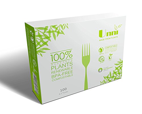 UNNI 100% Compostable Biodegradable Corn Starch 6.5" Forks, 100-Piece ,US BPI and European DIN CERTCO Certificated,Premium Quality & Sturdy Plant Starch Cutlery/Utensiles/Flatware,High-Heat Resistant