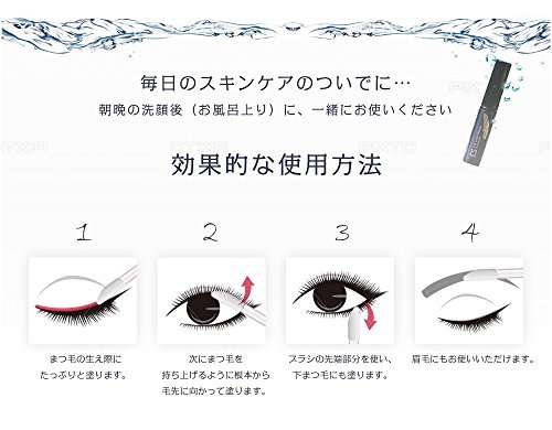 ・毎日朝晩の洗顔後(お風呂上り)の清潔なまつ毛にご使用ください。 ・目に入らないように注意し、まつ毛の生え際にたっぷりと塗布してください。 次に、まつ毛を持ち上げるように根元から毛先に向かって塗布します。 ブラシの先端部分を使い、下まつ毛にも同様に塗布してください。 ・まつ毛だけでなく、眉毛にもご使用いただけます。 ※アイメイクをする場合は、本品が乾いた後にアイメイクを行ってください。 ※まつ毛エクステ、まつ毛パーマをされている方もご使用いただけます。