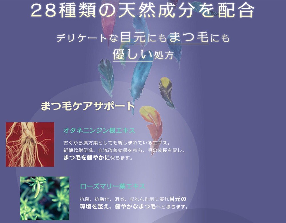 ②.こだわりの成分を贅沢に配合した美容液です。 28種類の天然成分を贅沢に配合し、ダメージを受けたまつ毛をコートして補修。 ハリ・コシを与え美しいまつ毛へと導きます。 (WIDELASH配合)