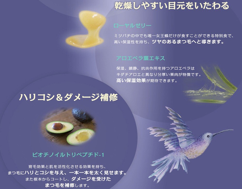 ① .まつ毛サイクルに合わせた集中根元ケアで、自然な美しいまつ毛へと導きます。 まつ毛が生えてから抜け落ちるまでの期間を長く保つことでまつ毛の密度は高まり、 印象的な目元へと導きます。