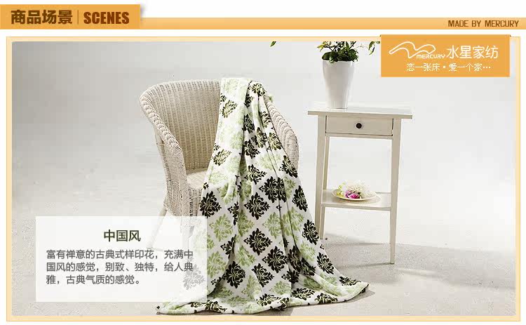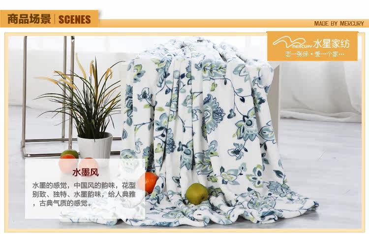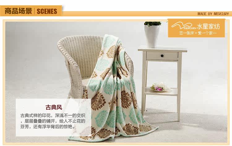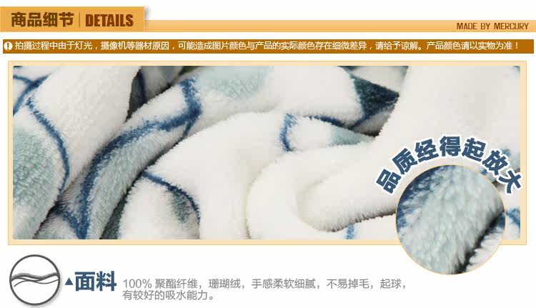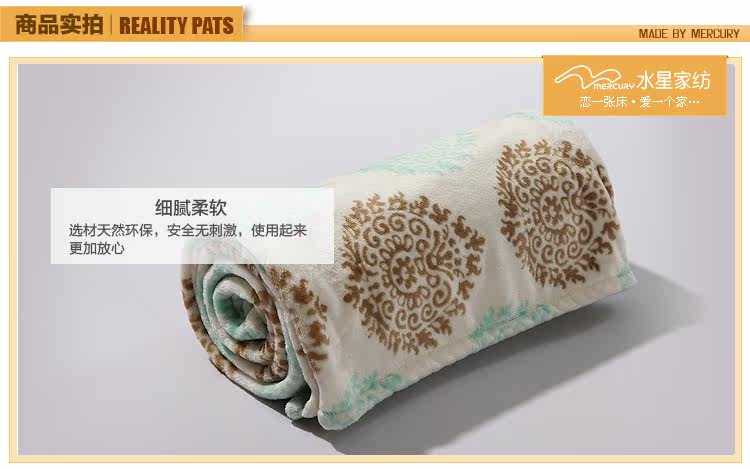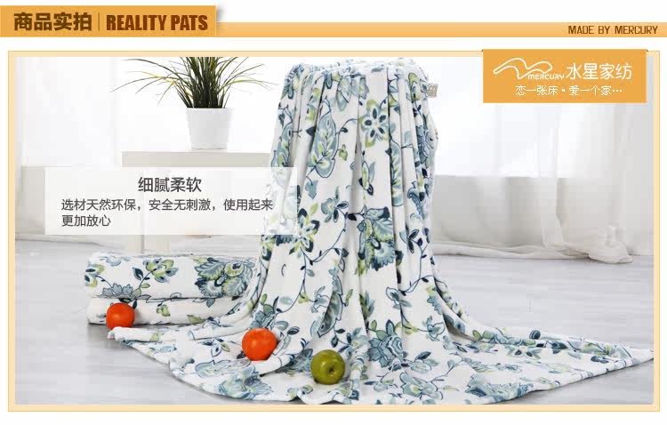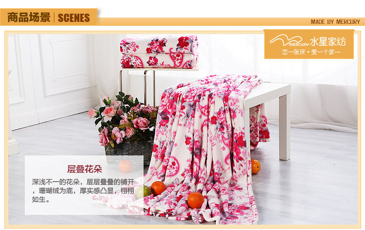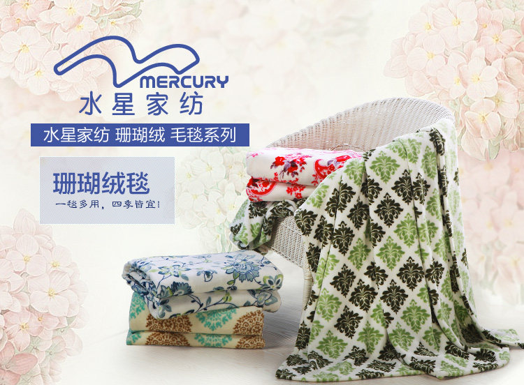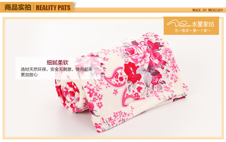 This paragraph for the mercury 2012 new coral blanket, soft and delicate, not easy to lose hair, pilling, has good water absorption capacity. Natural safe and stimulating,and using it is assured. Exquisite printing blanket lay in bed to a decorative effect.Coral carpet can be a blanket use, more and more modern consumers favor.