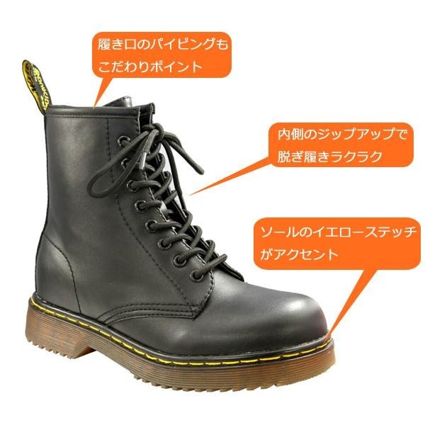 | ベーシックな8ホールのレースアップブーツです。インヒール内蔵でさりげなく美脚&足長効果!内側にジップアップが付いているので、脱ぎ履きも簡単です。合成皮革を使用しており、軽量で汚れや水にも強いのがポイント!!オールシーズン活躍する優れものです♪ |