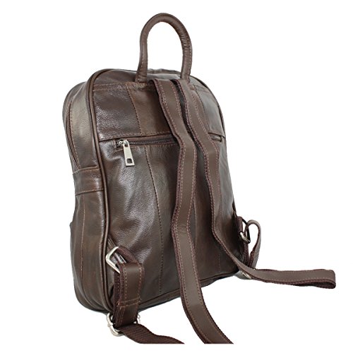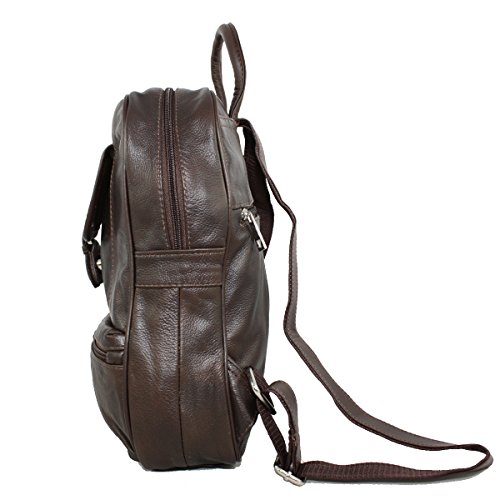 This classic vintage style women's leather backpack will be your favorite for years. It features a signature zip around top main compartment which is very roomy for all your necessities with extra inner zippered pockets and pouches. The front side has a flap over pocket with a vintage buckle magnetic snap-on and a crossover zip pocket at the bottom. The rear side has another zip pocket. The top handle is padded for easy and comfortable carrying. The padded straps are adjustable for classic backpack wearing or a shoulder sling bag.Feature