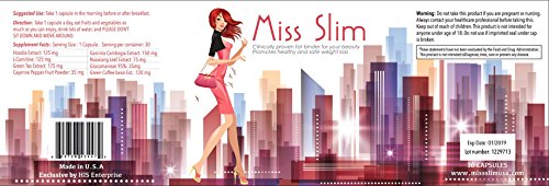 -. Binding : Health and Beauty -. Brand : Miss Slim -. Feature : Made in a Veggie Cap (no gelatin) / Manufactured in an FDA registered laboratory / GMP Certified / Made in the USA / Contains 30 capsules per bottle -. IsAdultProduct : 0 -. Label : Miss Slim -. Manufacturer : Miss Slim -. MPN : 609728434472 -. PackageQuantity : 1 -. PartNumber : 609728434472 -. ProductGroup : Health and Beauty -. ProductTypeName : HEALTH_PERSONAL_CARE -. Publisher : Miss Slim -. Studio : Miss Slim -. Title : Miss Slim Weight Loss Manufactured in an FDA registered laboratory