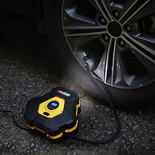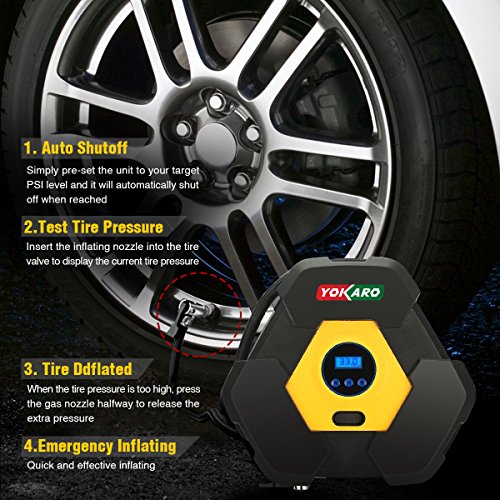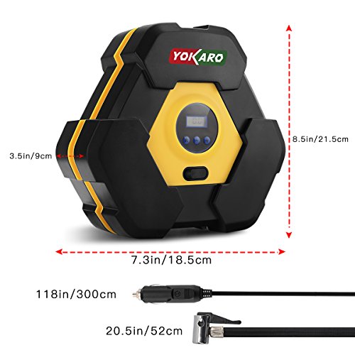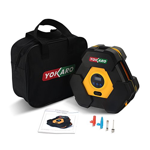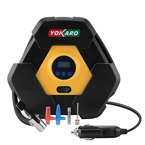 Yokaro Portable Tire Inflator 12-Volt 150-PSI Air Pump (10 Minutes @ 33 PSI) with Digital Gauge, 3 High-air Flow Nozzles & Adapters